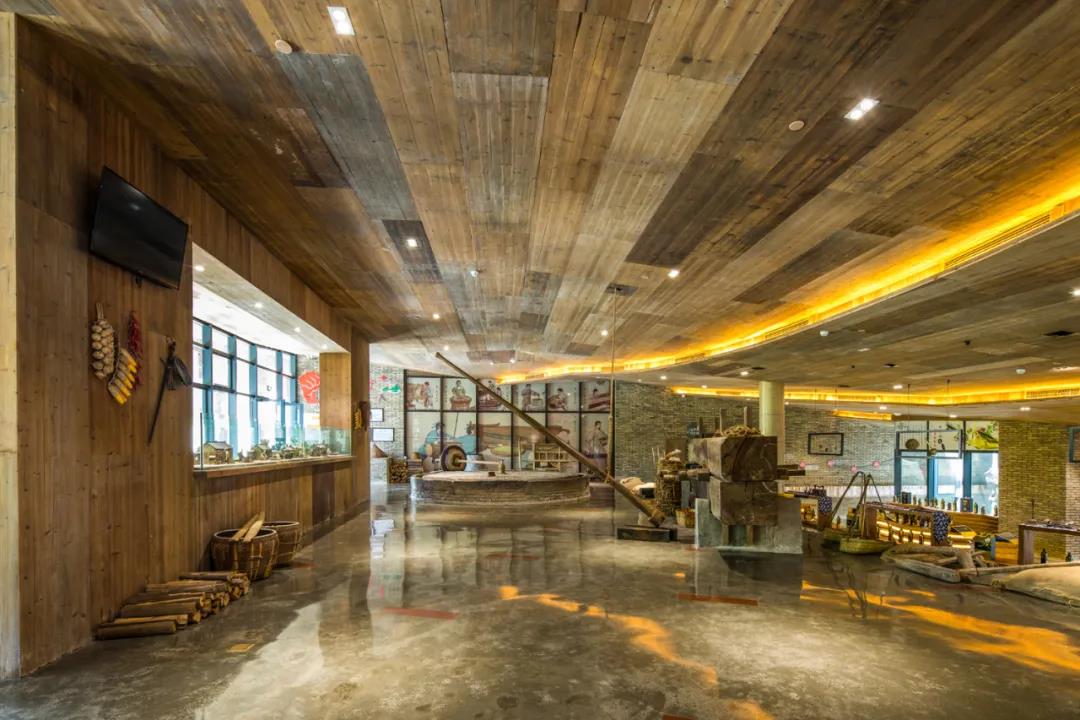 為了給游客帶來(lái)沉浸式體驗,港源裝飾項目團隊在針對茶油工坊進(jìn)行室內裝修時(shí),安排專(zhuān)人去當地村落中逐戶(hù)尋找原生態(tài)老木板,加以梯田式屋梁造型施工,從細微之處便竭盡所能地還原我國古老文明的古樸雅致和文化底蘊。